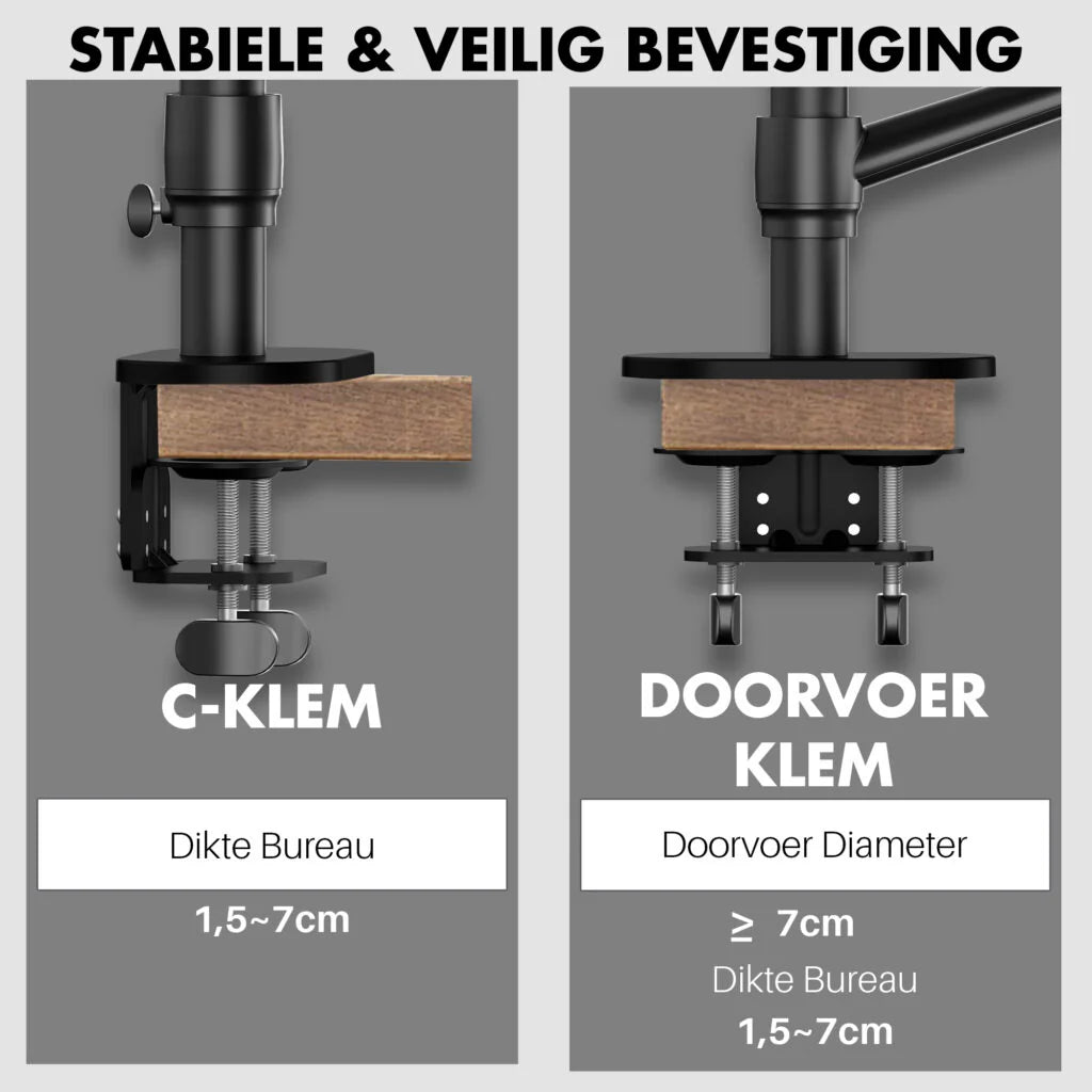 De monitor arm wordt geleverd inclusief bureauklem, dit maakt het zeer gemakkelijk de laptop standaard te klemmen aan uw bureaublad. U kunt binnen 10 minuten uw monitor arm gereed hebben om te gebruiken! De kabels kunt u stijlvol wegwerken aan de achterkant van de beugel waardoor deze niet in het zicht zijn. De monitorbeugel is geschikt voor laptops tussen de 10-17 inch of monitoren tussen de 17-32 inch.