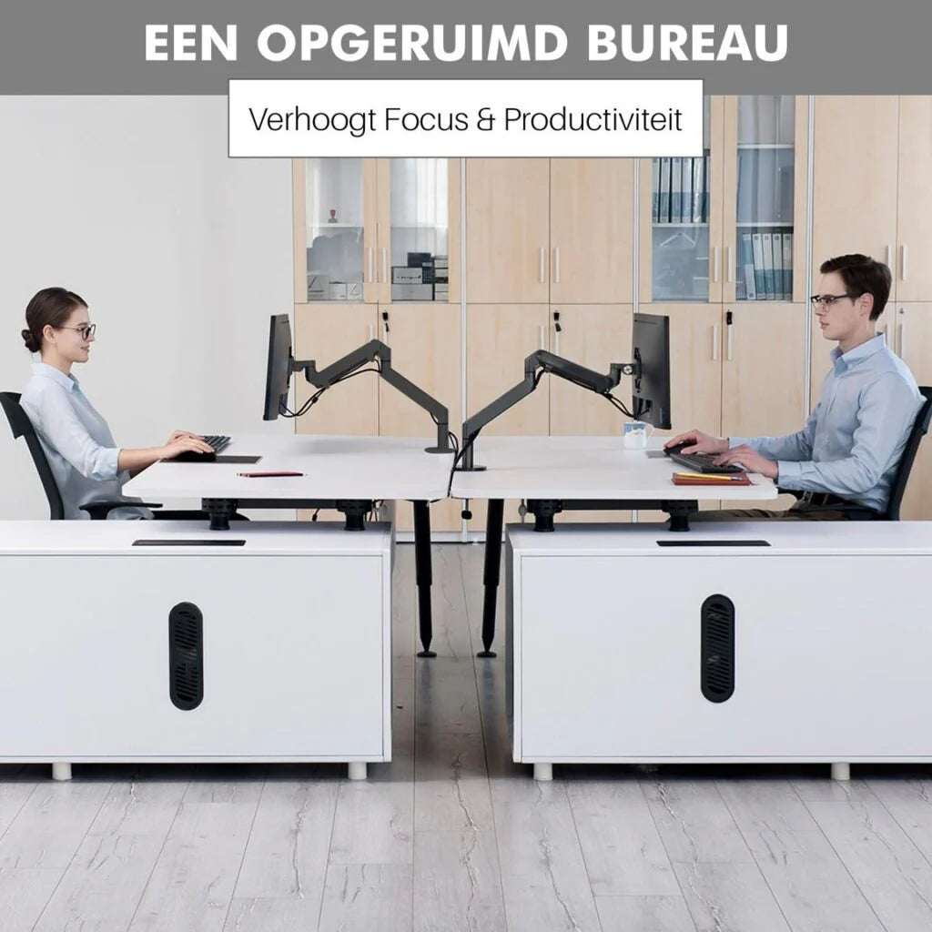 Doordat de schermen nu boven uw bureau zweven is het schoonmaken van uw bureau ontzettend simpel geworden. De kabels zijn netjes weg te werken in de daarvoor bestemde kanalen. Even snel een doekje over het tafelblad en al het stof en rommel is verdwenen!