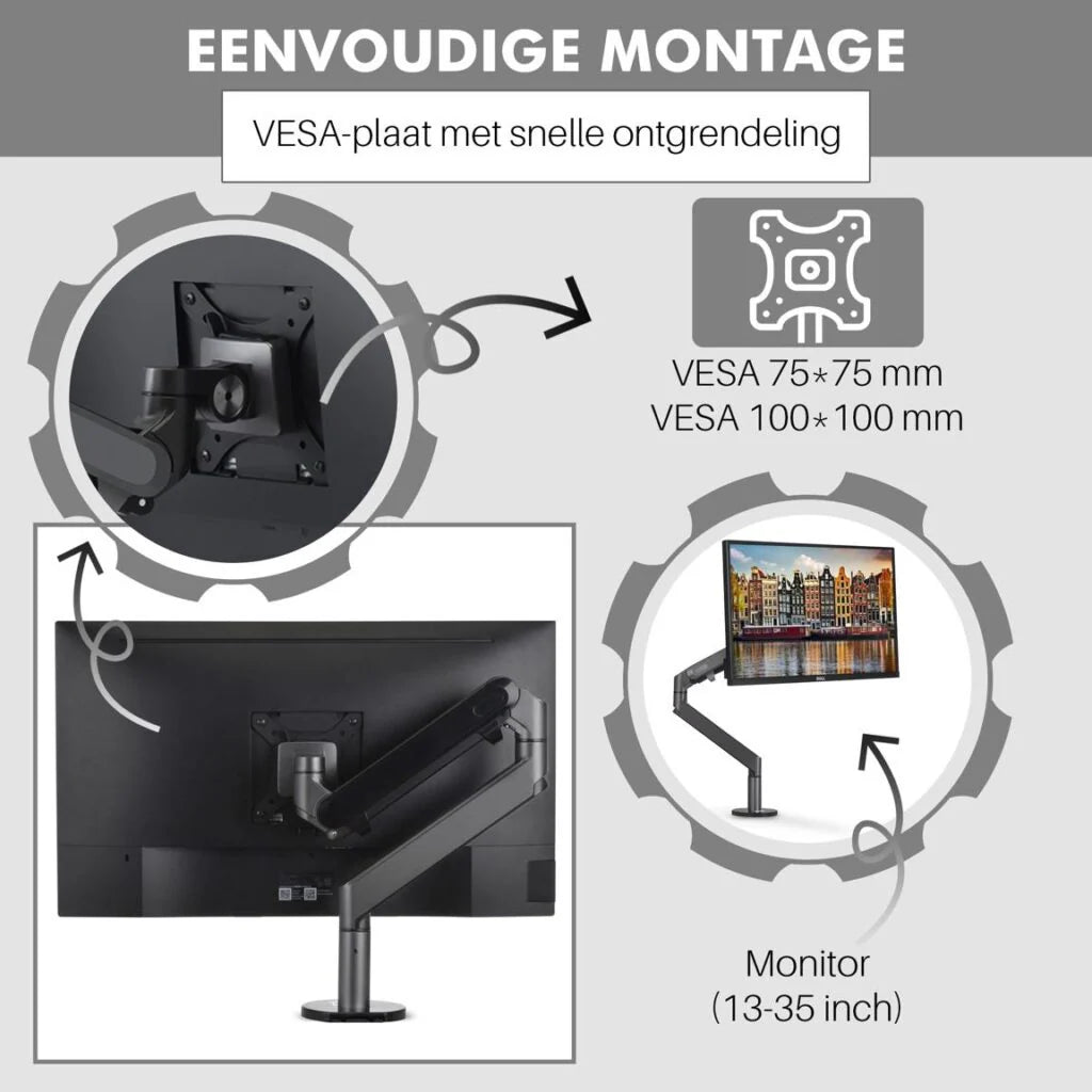 De monitor kan met een VESA-bevestiging aan de arm worden vastgemaakt. Het is dus belangrijk dat er schroefjes in de achterkant van uw monitor kunnen. Het koppelstuk kan worden bevestigd aan VESA 7,5 cm x 7,5 cm en VESA 10 cm x 10 cm aansluiting. Praktisch gezien kan koppelt deze arm aan elke computermonitor, maar wij raden altijd aan om dit te controleren voor bestelling, zo voorkomt u teleurstelling achteraf.