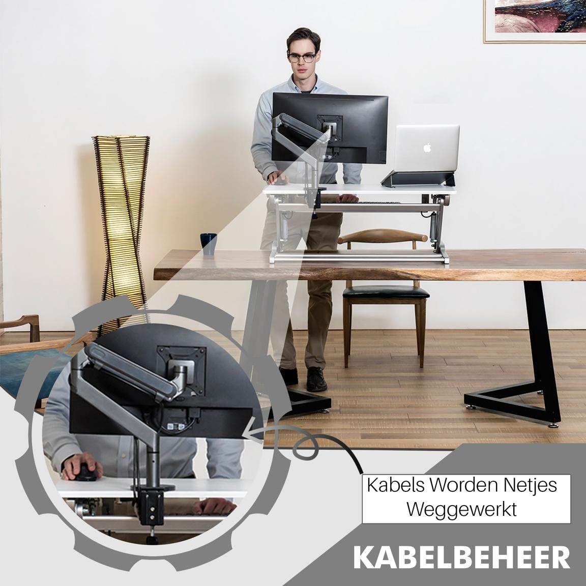 De monitor arm wordt geleverd inclusief bureauklem, dit maakt het zeer gemakkelijk de laptop standaard te klemmen aan uw bureaublad. Je kan de monitorbeugel op twee verschillende manieren aan je bureau bevestigen, met een c-klem of met een doorvoerklem door het kabeldoorvoergat van het bureau heen. Je bureau moet hiervoor wel tussen de 15 en 70 mm dik zijn.U kunt binnen 10 minuten uw monitor arm gereed hebben om te gebruiken! De kabels kunt u stijlvol wegwerken aan de achterkant van de beugel waardoor deze niet in het zicht zijn. De monitorbeugel is geschikt voor monitoren tussen de 17-27 inch.
