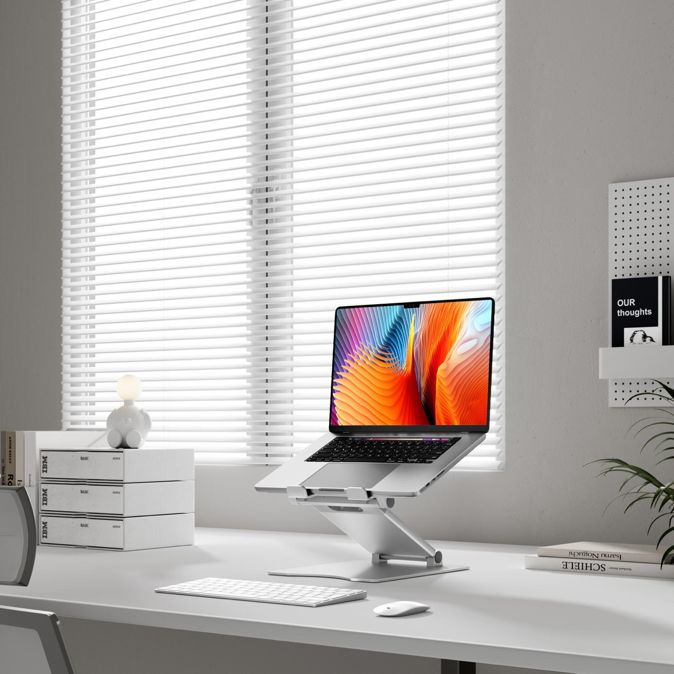 The laptop stand is suitable for laptops from 8 to 17.3 inches. To keep laptops of this size in place, the stand is equipped with an anti-slip layer. Four silicone anti-slip pads are attached to the top and bottom. These pads ensure that the stand does not wobble while typing and that the laptop is firmly in place. The silicone pads also protect your laptop from scratches on the outside.