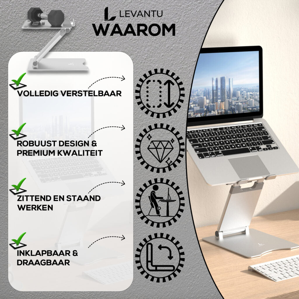 De Levantu Ergonomische laptop verhoger/laptop standaard helpt je aan de juiste rechte zithouding tijdens het gebruik van je laptop of tablet. Door het ergonomische ontwerp staat uw laptop precies op ooghoogte. Dit compacte, opvouwbare, universele laptop standaard zorgt dat u overal (thuis, kantoor of school) kunt werken zonder rug, nek of schouderpijn. Het aluminium van de standaard heeft een actief koelende werking. Geschikt voor alle tablets en laptops tot 17,3 inch.