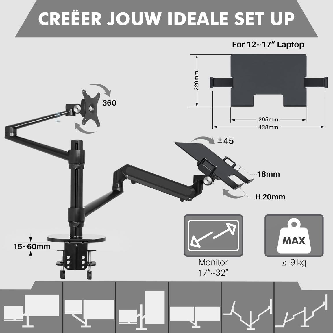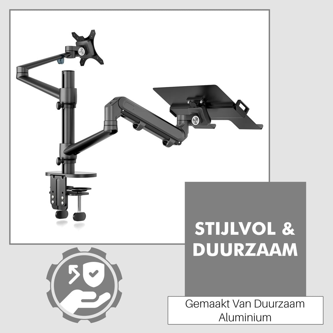 Het fijne aan de LEVANTU monitor standaard is dat u deze helemaal naar wens kunt verstellen. De individuele armen zijn beide in hoogte verstelbaar, ook kunt u deze naar u toetrekken als u daarom wenst. De arm van de monitor is zelfs 360 graden draaibaar. U heeft dus de mogelijkheid de schermen in alle standen die u wenst te verkrijgen, ideaal en zeer stijlvol. Ook heeft u de mogelijkheid om te kiezen of u uw laptop links of rechts van de monitor wilt. Hierdoor past u uw werkplek ideaal aan uw persoonlijke situatie en maakt u het bijzonder ergonomisch.