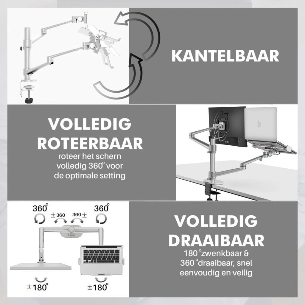 Deze arm is voor iedereen die achter een notebook werkt. Uit onderzoek is gebleken dat het werken met twee schermen zorgt voor een 40% verhoging van uw productiviteit. Dit komt omdat u met meerdere applicaties tegelijk kan werken en niet steeds van applicatie hoeft te wisselen op een scherm. Veel efficiënter dus voor elke ondernemer of kantoormedewerker.